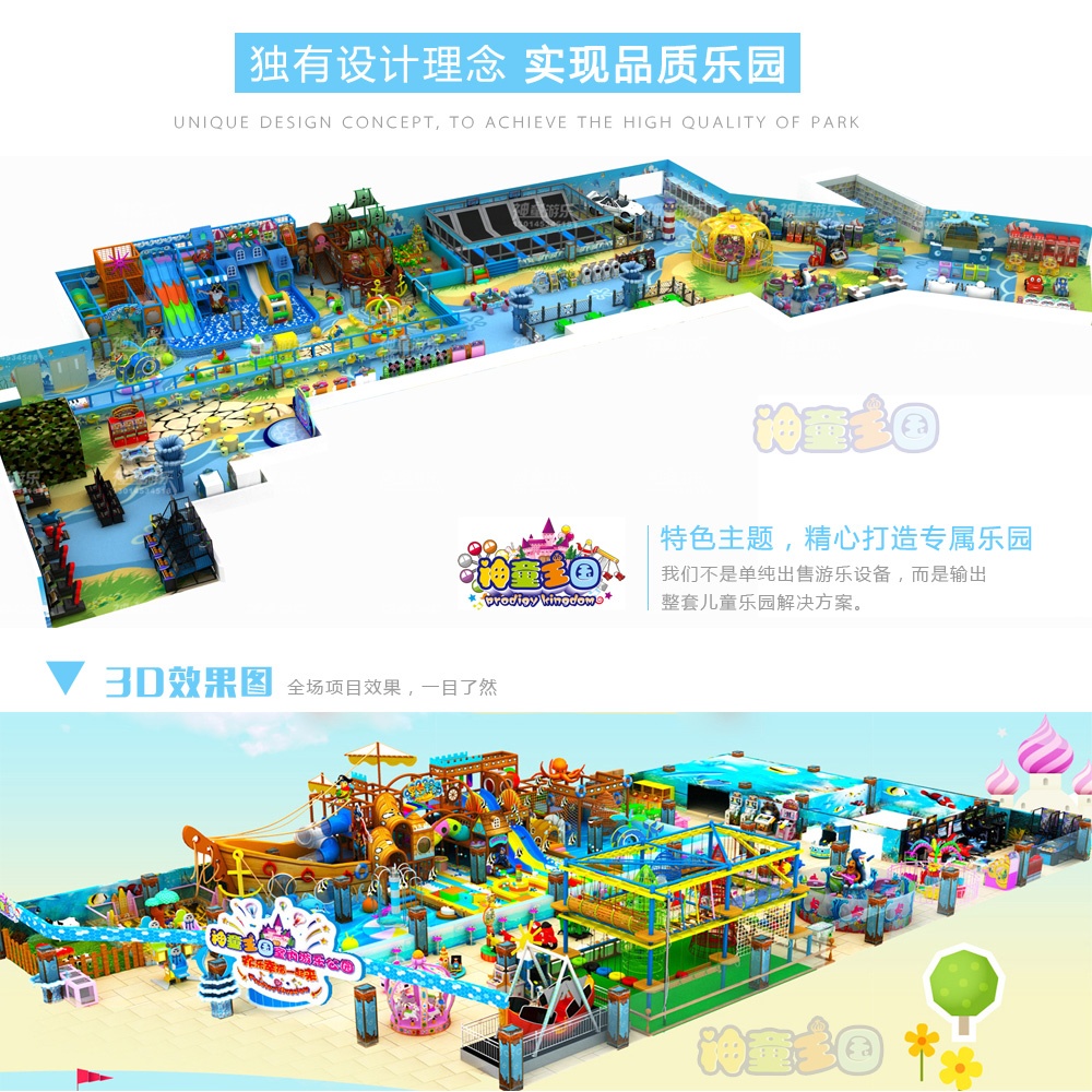 主题定位:大海,蔚蓝;海风,清凉;沙滩,热情!海洋象征一种胸怀,是一个未知、等待我们去探险的世界!儿童接触海洋的机会较少,而且相对来说比较危险。海洋的结构色系,多姿多彩的海洋生物,海盗船、大白鲸、深海鱼、潜水艇等开发活泼的动感元素,天衣无缝的搭配组合,将海洋海纳百川的精神赋予乐园,给孩子们营造一个神秘奇特的海洋世界,在游戏的过程中感受益智趣味、欢乐激情、积极乐观!